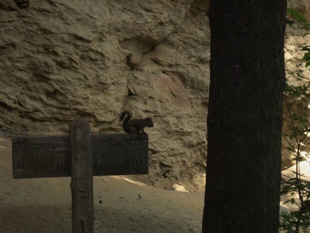 I continued on using the headlamp until I reached Alum Cave Bluff. The Trails Forever Crew restored this trail a few years back—they did a great job. There were wooden steps heading up to the bluff to help prevent erosion. It is still dry and dusty—as it has always been. A boomer squirrel was chattering and greeting the daylight. I took a few minutes to sit and adjust—the headlamp came off, as did a layer of clothing. The thought crossed my mind to spread some of mom’s ashes here, but this is a unique place with rare minerals, some of which are found nowhere else on earth. This incredibly sere scene in the middle of a rainforest should be protected, and it was not in accord with the permit. Ashes to ashes, dust to dust—but not here! Not amidst this dust!