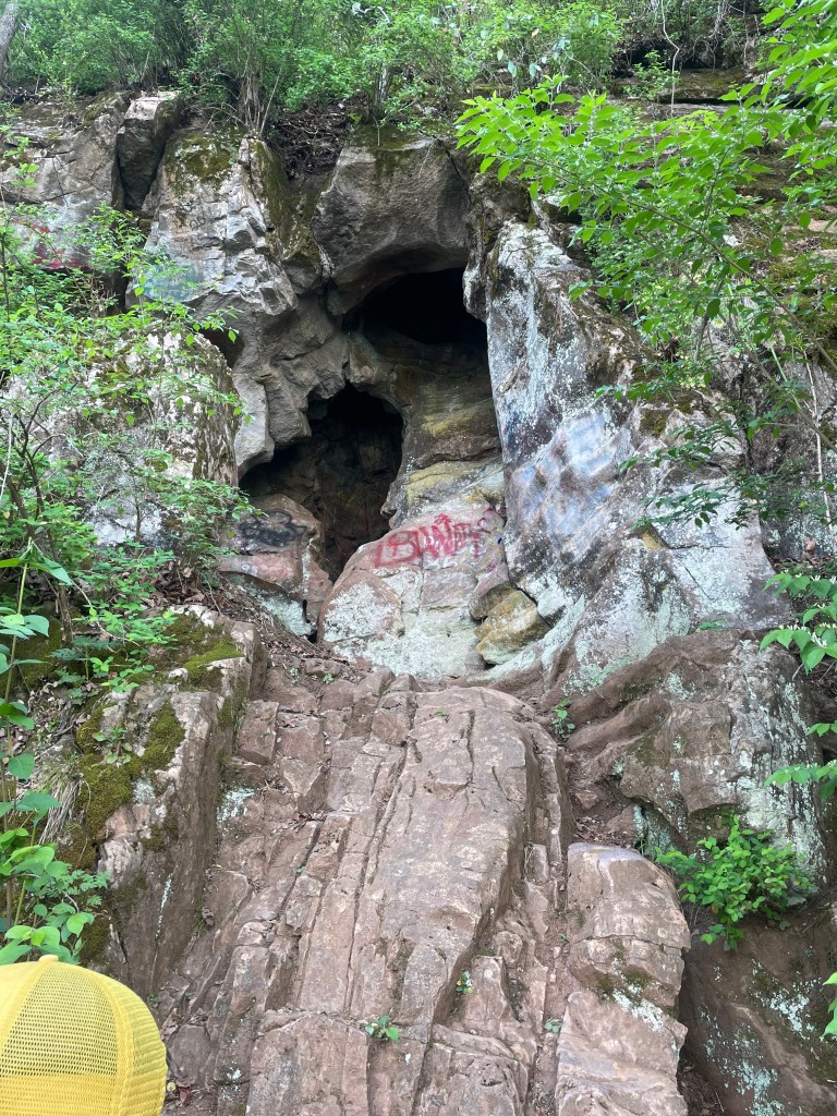 I was sorry to see graffiti on the rocks at the entrance. I was also wondering about a group of young men who passed us with their headlamps on their heads—obviously going into the cave even though White-Nose Syndrome is affecting the bats in our area.